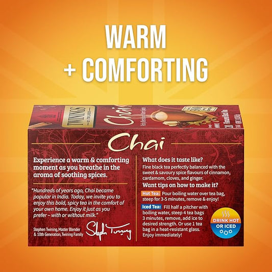 Twinings Chai Black Tea Individually Wrapped Bags, 20 Count (Pack of 6), Sweet, Savoury Spices, Caffeinated, Enjoy Hot or Iced, 120 Teabags