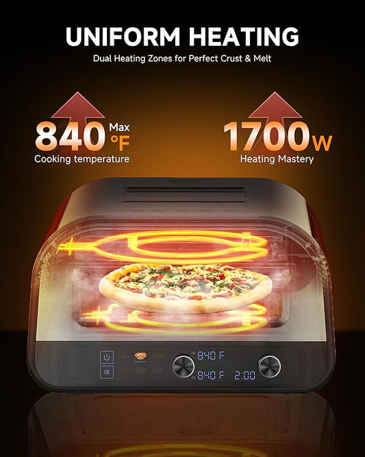 Upgraded Pizza Oven Heats up to 840°F Makes 12 Inch Pizzas in 90 Seconds Countertop Electric Pizza Maker with 6 Touchscreen Presets Pizza Stone & Peel Included - Stainless Steel