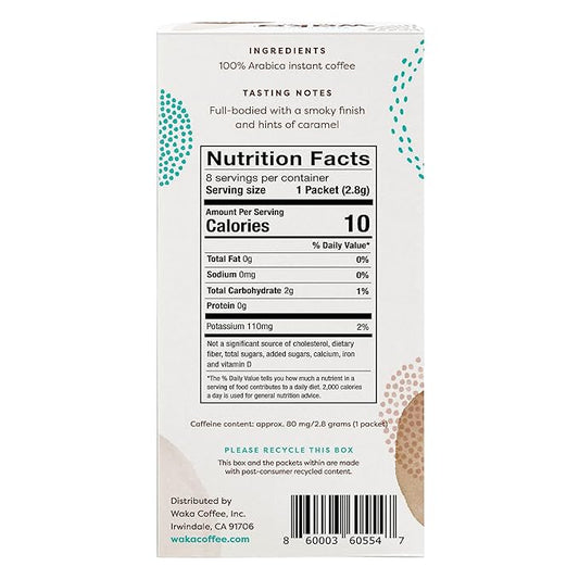 Waka Premium Instant Coffee Sachets — 100% Arabica Freeze Dried Beans — For Hot or Iced Coffee (8 Count, Dark Roast)