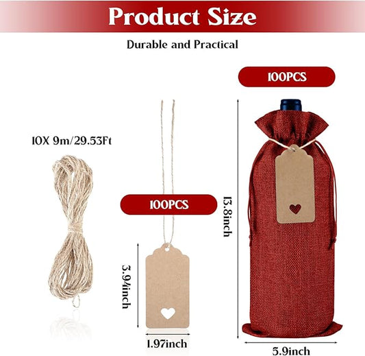 Windyun 100Pcs Burlap Wine Bags Drawstring Wine Bottle Gift Sacks with Tags 5.9 x 13.8 Inch Jute Burlap Plain Wine Bags for Wedding Birthday Blind Tastings Christmas Travel Party (Wine Red)