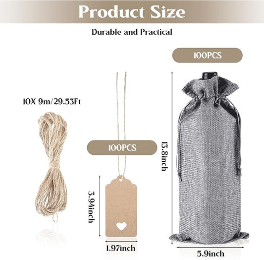 Windyun 100Pcs Burlap Wine Bags Drawstring Wine Bottle Gift Sacks with Tags 5.9 x 13.8 Inch Jute Burlap Plain Wine Bags for Wedding Birthday Blind Tastings Christmas Travel Party (Gray)
