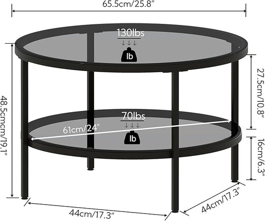 Yusong Round Glass Coffee Tables for Living Room, 2-Tier Circle Coffee Table with Storage, 26" Modern Center Accent Table with Light Black Glass, Small End Table for Small Space, Bedroom