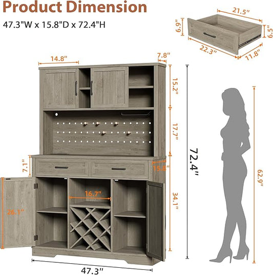 72" Coffee Bar Cabinet with Power Outlet & LED Light, Farmhouse Large Kitchen Hutch with Sliding Barn Door, Tall Bar Cabinets with Storage Drawers & Wine Glass Rack,Pantry China Cabinet for Home,Grey