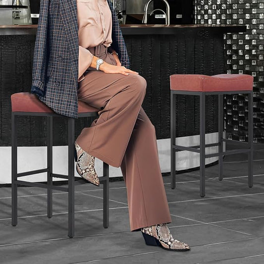 Athena Collection Counter Height Bar Stools Set of 2, 31.5 Inches Saddle Bar Stools with Leather Upholstered and Metal Legs, Backless Barstools for Counter, Kitchen Island, Dining Room, Mocha