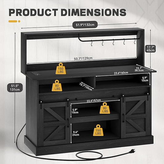 YITAHOME 52" Farmhouse Coffee Bar Cabinet with Storage, Buffet Cabinet with Goblet Holder, 5 Hooks, Power Outlets, Sideboard Cabinet with Sliding Barn Doors for Kitchen & Living Room (Black Oak)