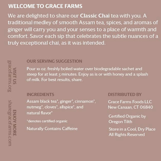 Grace Farms Organic Classic Chai Black Tea, 16 Pyramid Sachets | Ginger & Spices | Fairtrade & Kosher |Gives Back 100% of Profits