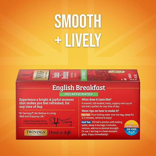 Twinings Decaffeinated English Breakfast Black Tea Individually Wrapped Bags, 25 Count (Pack of 6), Flavourful, Robust, Enjoy Hot or Iced, 150 Teabags