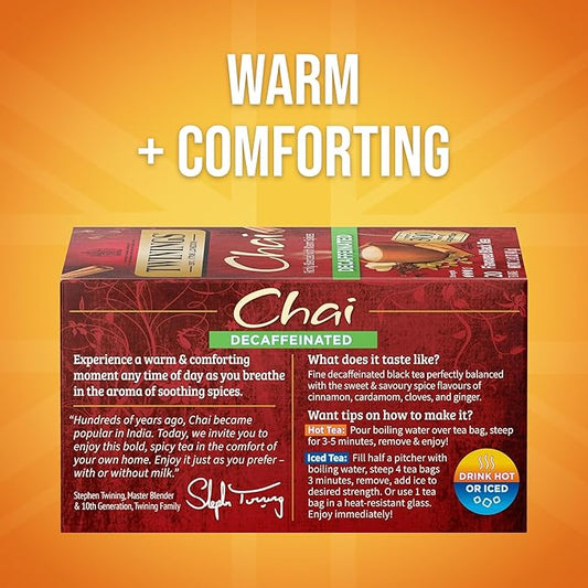 Twinings Decaffeinated Chai Individually Wrapped Bags, 20 Count (Pack of 1), Sweet, Savoury Spices, Enjoy Hot or Iced, 20 Teabags