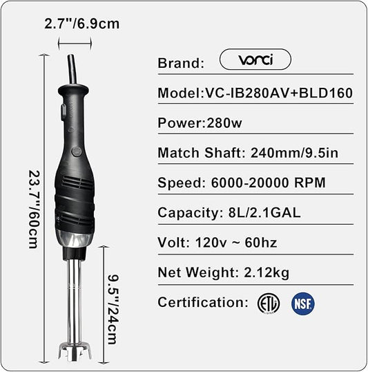 VONCI 280W Commercial Immersion Blender, Light Duty Hand Blender with Variable Speed 6000-20000RPM, Handheld Stick Mixer with 9.5" Detachable Shaft, Professional Blender for Restaurant Kitchen.