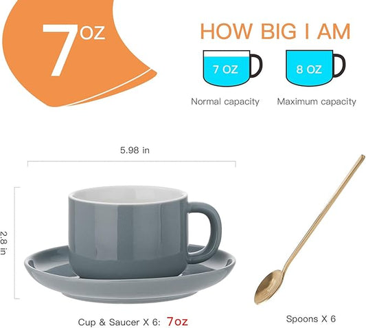7 oz Coffee Cups with Saucers Spoons - Set of 6 Cappuccino Cups, Grey Porcelain Cups Serving for Tea Espresso Latte Mocha