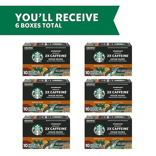 Starbucks K-Cup Coffee Pods, Medium Roast Coffee With 2X Caffeine House Blend For Keurig Coffee Makers, 100% Arabica, 6 Boxes (60 Pods Total)