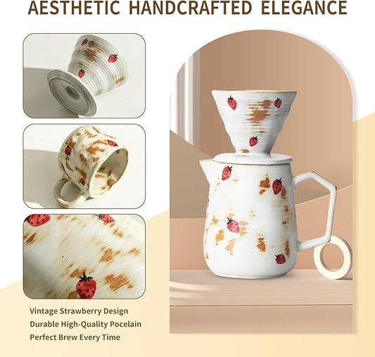 Handcrafted Pour Over Coffee Maker Set with Coffee Cup with Strawberry Pattern 20 Count Paper Filter V60 Drip Coffee Maker 20 oz Coffee Dripper (Strawberry)