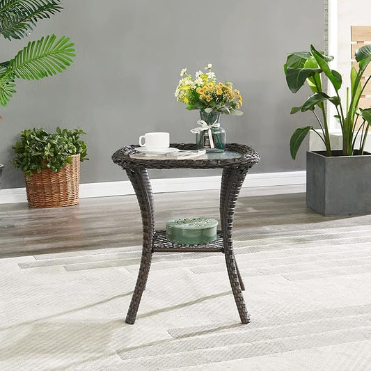 HUMMUH Patio Wicker Side Table Outdoor, Rattan End Table Glass Top Coffee Table with Storage Brown