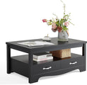LINSY HOME Farmhouse Coffee Table with Storage, Wood Coffee Table for Living Room, Open Display Area and Storage Drawers with Metal Handles, Chic Style with Curved Base, Black