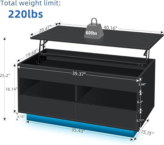 HOMMPA 40'' Lift Top Coffee Table, Black Coffee Tables with Storage for Living Room, LED Modern Coffee Table, Flip Top Center Table with 2 Drawers & Hidden Compartment, Lift Up Wooden Coffee Table