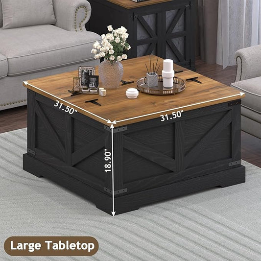 Farmhouse Coffee Table with Hidden Storage Compartment, Black Square Coffee Table for Living Room, Wood Center Table with Hinged Lifting Tabletop for Home