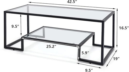 Metal Glass Coffee Table, Black Accent Modern Tempered Glass Side Table, Additional Storage Shelf, for Living Room Home Classy Furniture Office Decor