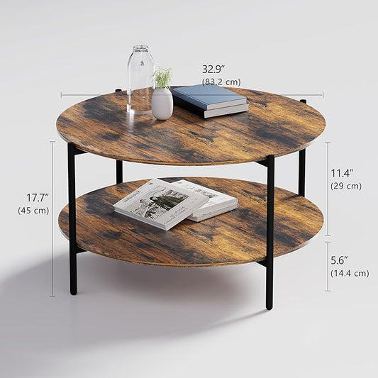 Round Coffee Table, 2-Tier 32.9" Circle Coffee Tables with Storage Wood Rustic Farmhouse Center Circular Coffee Table for Living Room Bedroom Balcony Office - Walnut