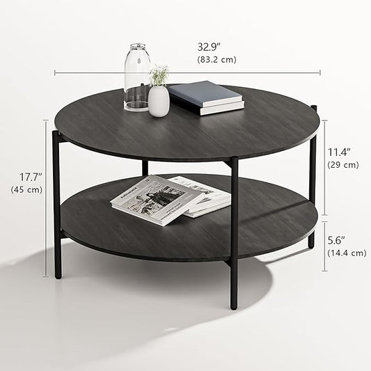 Tribesigns 31.7" Round Industrial Coffee Table with 2-Tier Storage Shelves, Modern Wood & Black Metal Accent Center Table for Living Room, Home Office – Easy Assembly