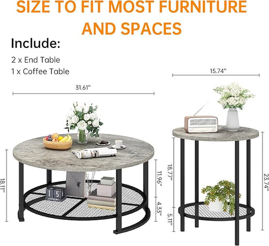 DKLGG Living Room Coffee and End Table Sets, Wooden Modern Rustic Center Table with Two Side Tables, 3 Piece Living Room Coffee Table Set with Storage for Living Room, Apartment (Grey)