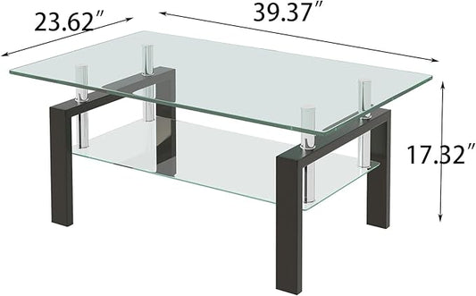 Glass Coffee Table Rectangle Living Room Center Table, with Tempered Glass Tabletop Black Metal Leg,for Living Room and Office (Dou-Clear Glass)
