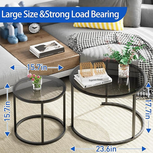 aboxoo Nesting Coffee Table Set of 2, Small Round Glass Nesting Tables for Living Room Bedroom, Accent Tea Table with Metal Frame Modern Industrial Simple
