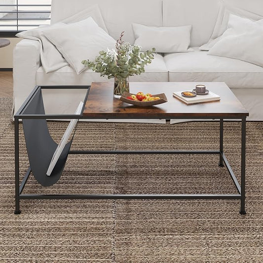 SENIG Brown Rectangle Wood and Metal Coffee Table with Storage Shelf for Small Living Rooms with Pocket