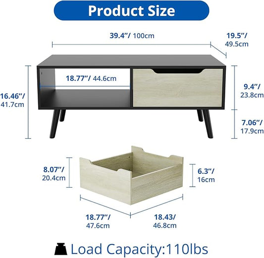 Black Rattan Coffee Table, Mid Century Modern with Drawer & Shelf, 39'' Wooden Boho Coffee Table for Living Room