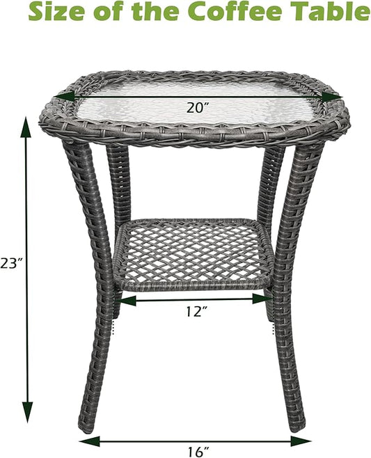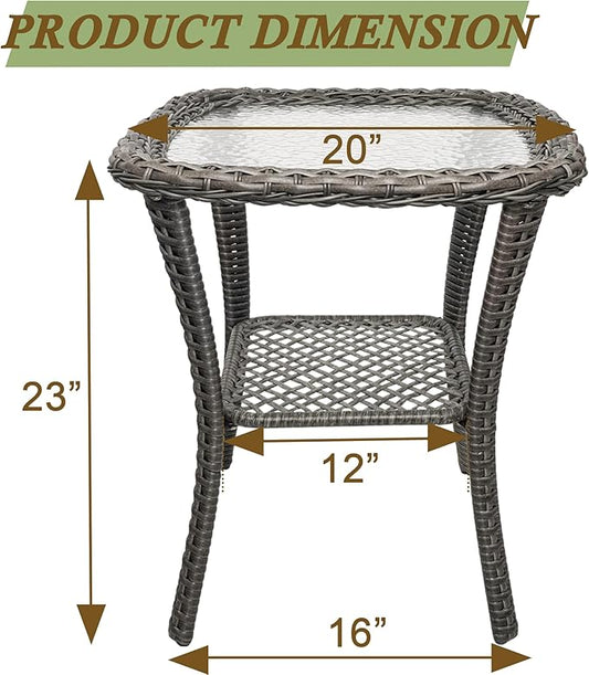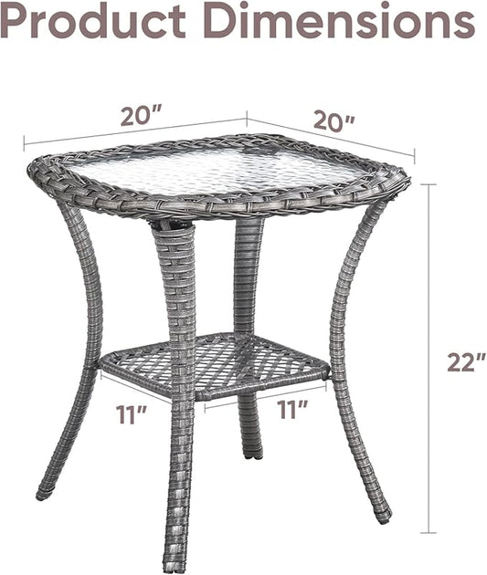 Patio Wicker Side Table, Outdoor PE Rattan End Table with 5mm Tempered Glass Top and 2-Tier Storage Shelf, 20" Square Coffee Table for Deck Porch Garden Backyard-Grey