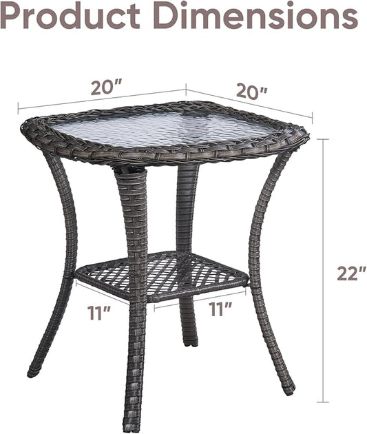 Patio Wicker Side Table, Outdoor PE Rattan End Table with 5mm Tempered Glass Top and 2-Tier Storage Shelf, 20" Square Coffee Table for Deck Porch Garden Backyard-Dark Brown