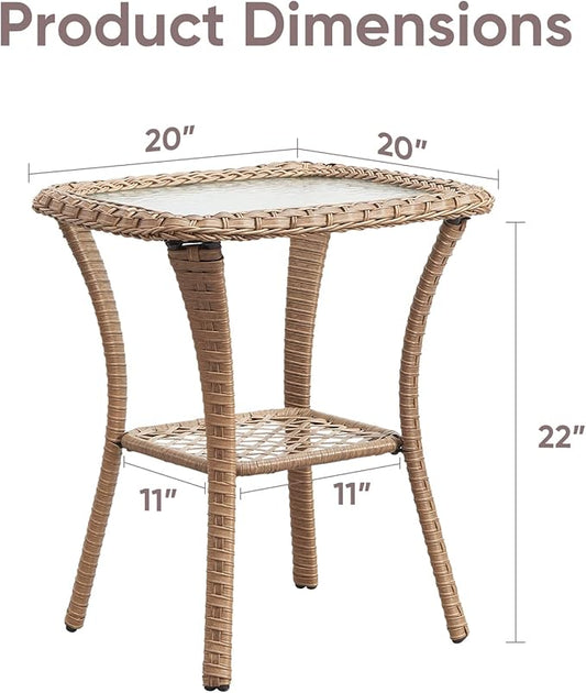 Patio Wicker Side Table, Outdoor PE Rattan End Table with 5mm Tempered Glass Top and 2-Tier Storage Shelf, 20" Square Coffee Table for Deck Porch Garden Backyard-Yellow