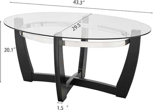 Oval Glass Coffee Table, 43.3" Solid Wood Tea Table with Tempered Glass Tabletop, Modern Glass Sofa Center Table Cocktail Table with Black Cross Base for Living Room Home Office,KFZ1331