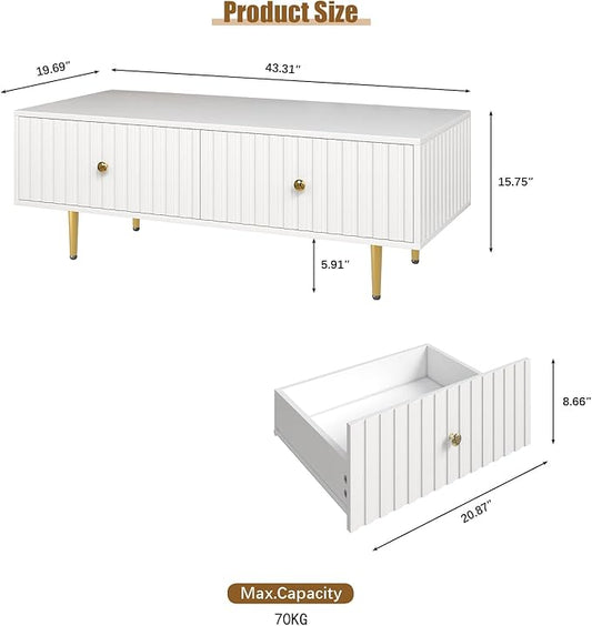 Modern Coffee Table with Storage with 2 Big Drawers, White Rectangle Coffee Table for Living Room, Wooden Fluted Table Accent Tea Table for Living Room Apartment Small Space