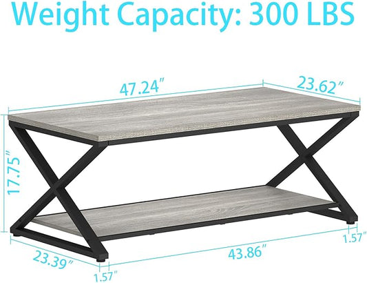HSH Coffee Table with Storage, Farmhouse Grey Living Room Center Table, Industrial Wood and Metal Rectangle Coffee Tables, Simple Rustic 2 Tie Cocktail Tea Table for Home Office Bedroom, 47 Inch