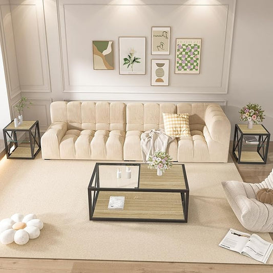 Rustic Coffee Table Set of 3, End Table Mordern Living Room Table Set with Tempered Glass Top Splicing Wood MDF, Black Metal Frame Industrial Style, Natural