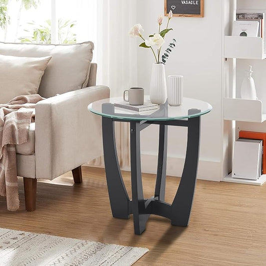 Glass End Table, 23.5" Round Side Tables with Tempered Glass Top Cross and Solid Wood Base Small Night Stand for Living Room Office Apartment Black
