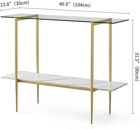 Glass Console Table for Living Room, Foyer & Entrance, 2-Tiers Mid-Century Modern Sofa Table with Clear Glass Top, White Marble Finish Wood Shelf and Gold Finish Frame