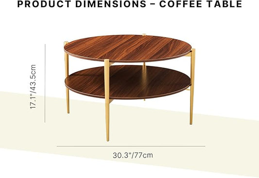Shrine Round Glass Coffee Table, Mid-Century Modern Design, D30 x H17 in, Two-Tier Round Table with Walnut MDF Shelves, Sleek Conical Metal Legs with Gold Finish