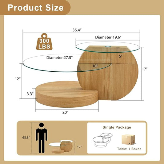 35 Inch Glass Coffee Table,Round Coffee Table with 2-Tier Tempered Glass Tabletop,Easy to Clean Circle Coffee Table with Sturdy Base for Living Room,Office (Wood-Colored Base)