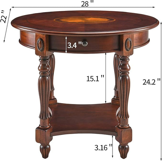 Solid Wood Oval End Table with Drawer and Storage Shelf, Traditional Vintage Side Table Polished Edging Bedside Nightstand for Living Room Bedroom Home, Cherry Walnut