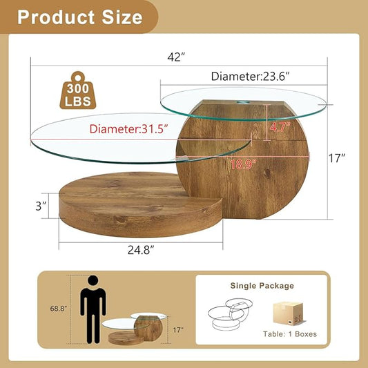 42 Inch Glass Coffee Table,Round Coffee Table with 2-Tier Tempered Glass Tabletop,Easy to Clean Circle Coffee Table with Sturdy Base for Living Room,Office (Brown Colored Base)