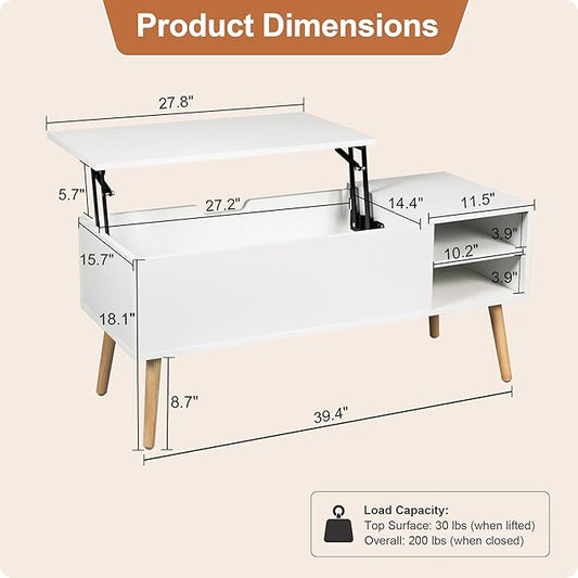 ALINE FURNITURE White Coffee Table Lift Top - Coffee Table with Solid Wood Legs, Hidden Storage Compartment & Open Shelves - 40" Lift Up Coffee Tables for Living Room