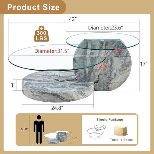 42 Inch Glass Coffee Table,Round Coffee Table with 2-Tier Tempered Glass Tabletop,Easy to Clean Circle Coffee Table with Sturdy Base for Living Room,Office (Light Gray Marble Colored Base