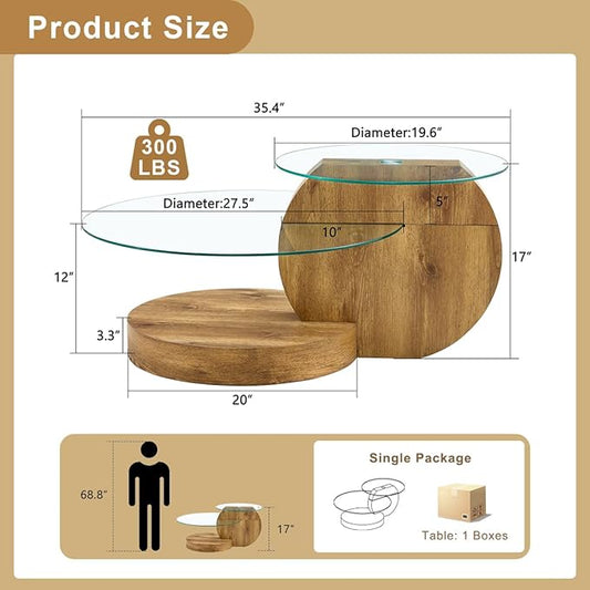 35 Inch Glass Coffee Table,Round Coffee Table with 2-Tier Tempered Glass Tabletop,Easy to Clean Circle Coffee Table with Sturdy Base for Living Room,Office (Brown Colored Base)