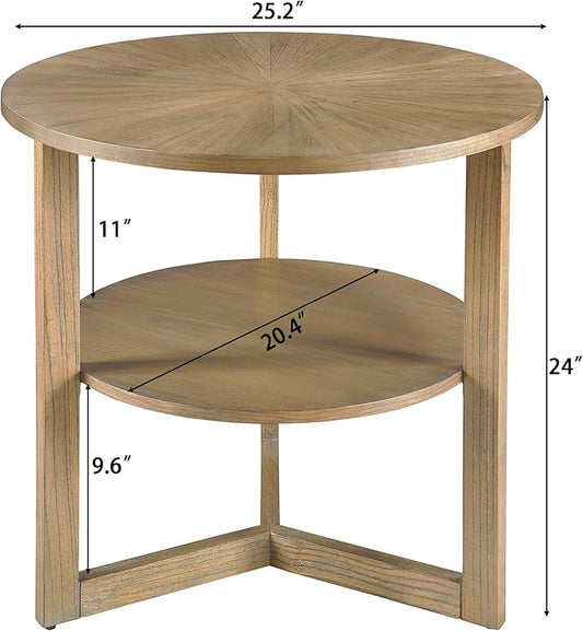 PADMA HOUSE 25" Round Wood End Table, 2-Tier Solid Wood Rounded Accent Side Table Circle Nightstand Table with Storage Shelf Vintage Furniture for Home Living Room Bedroom,Rustic Natural 3338