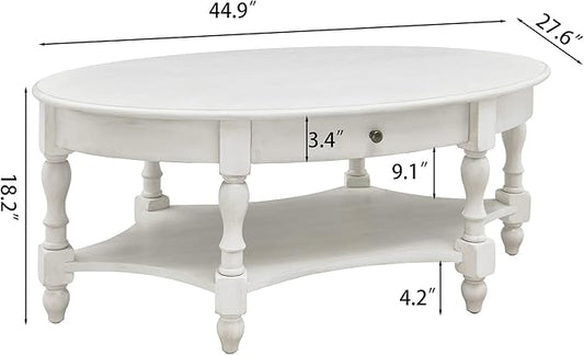 Solid Wood Oval Coffee Table with Drawer and Storage Shelf, 44.9" Traditional Retro Center Table Polished Edging Cocktail Tea Table for Living Room Bedroom Home, Antique White