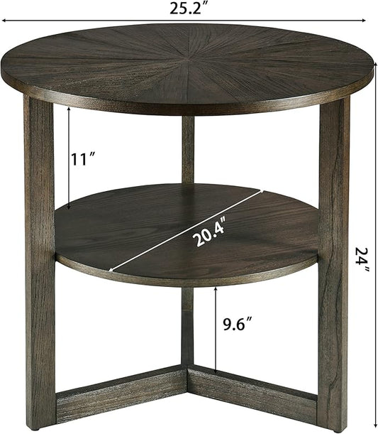 PADMA HOUSE 25" Round Wood End Table, 2-Tier Solid Wood Rounded Accent Side Table Circle Nightstand Table with Storage Shelf Vintage Furniture for Home Living Room Bedroom,Oak 3338OA
