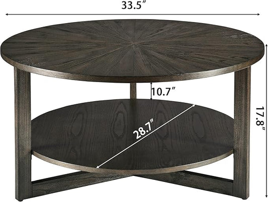 PADMA HOUSE 33.5" Round Wood Coffee Table, 2-Tier Solid Wood Rounded Circle Accent Coffee Table Center Cocktail Table Vintage Furniture for Home Living Room Bedroom,Black Brown 3338BK