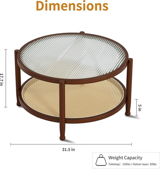 Rattan Round Coffee Table for Living Room, 32" Boho Circle Table with Tempered Glass Desktop Rustic Solid Wood Farmhouse Accent Center Storage Table (Walnut, 31.5" D x 31.5" W x 17" H)