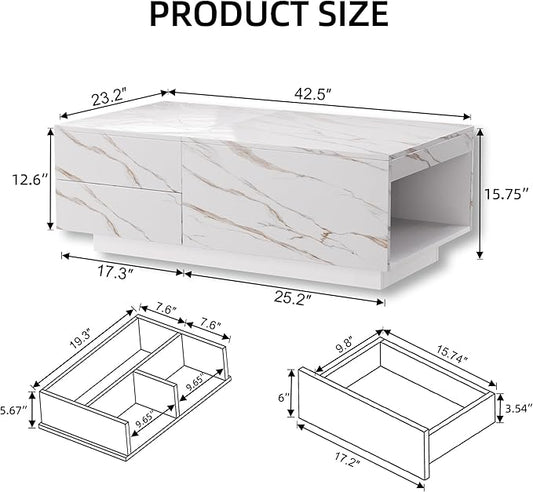 LED Coffee Table, 43" UV High Gloss Modern Center Table with 2 Drawers & Hidden Storage Compartment & Open Compartments, Extendable Modern Cocktail for Living Room,Home (Marble White)